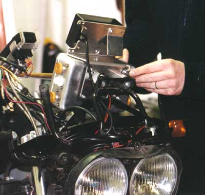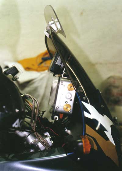 Erst jetzt kam der Stromanschluß fuer das Roadbook an die Reihe. Nun begann ich, die Kabel alle ordentlich unter dem Geweih zu verlegen und zu befestigen. Das war garnicht so einfach, das sich schon ein ordentlicher Wust an Kabel gebildet hatte. Danach konnte die Grundplatte von Touratech montiert werden. Es ergab sich noch ein Prpblem bei der Befestigung der Kontrolllampeneinheit. Die Haltevorrichtung war fuer die Sportversion (8 Dioden untereinander) vorgesehen und ich hatte nun die Standardversion. Mit Heißkleber habe ich die Einheit an den IMO geklebt und zur Sicherheit noch mit einem Kabelbinder fest angezogen. Diese Befestigung ist bombenstabil; ich habe es schon auf ueblen Holperpisten ausprobiert.