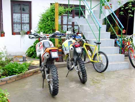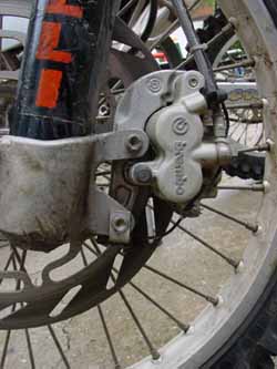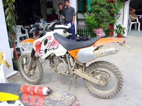 | das Ackergeraet ... Mit der (seligen) XL konnte man schon ganz gut umgraben, leider stellte sich ziemlich schnell heraus, das der hemmende Faktor fuer mehr Spass im Gelaende nicht mehr der Fahrer, sondern die Maschine war. Die Africa Twin bewege ich natuerlich auch gern im Gelaende, aber es gibt Sachen, die gehen damit einfach nicht und es gibt Sachen, die machen mit einem echten Stoppelhopser so richtig Spass. So musste nun ein neues Geraet her, zumal die Africa Twin die letzen heftigeren Offroadausfluege mit nicht unbetraechtlichen Schaeden eher nicht klaglos ueberstanden hatte. Die Sonntagscrosser aus der Enduro-Mailingliste habe ich wiederholt genervt, was ich mir denn holen sollte. Nach einigem Hin- und her und vielen Probefahrten entschloss ich mich nun, quasi als Weihnachtsgeschenk 2000, mir eine KTM LC4 620 Super Competition, Bj. 98 zu schenken: Das ist sie nun, schon auf dem Trailer festgezurrt. Interessant war ja fuer mich als bekennender Knoepfchendruecker, wie ich den Bock angekickt bekomme, schliesslich soll ja KTM “kick ten minutes” heissen, aber alles easy, Choke gezogen, drei mal kraeftig getrampelt und der Eintopf bollerte los. Klasse ... So, soweit das Wetter einen Ausritt erlaubt, werde ich mich mal an das Teilchen gewoehnen. Tja, das Wetter hat eine ordentliche Umgrabeaktion nun mittlerweile doch erlaubt. Ich kann nur sagen: ge*l. Ein himmelweiter Unterschied im Gelaende. Sollte ja auch sein. Achja, mit der KTM will ich aber keine 50 km Landstrasse fahren muessen, denn das wiederum macht ueberhaupt keinen Spass, das Strasse fahren ... So, es gibt etwas Neues von der KTM. Ich habe einen 20l Tank montiert, damit man beim typischen Enduro fahren nicht immer die 150 km Barriere im Schaedel hat. Erstaunlicherweise habe ich keine wesentlichen Aenderungen an der Maschine feststellen koennen, auch mit dem Fass liess es sich gutangehen. Nunja, bin halt mehr als 130 kg Mopped gewoehnt ;) Tja, auf der Enduromania 2001 hat sie mich dann nach der Haelfte im Stich gelassen: Pleuellagerschaden. Warum, weiss ich nicht genau. Dumm gelaufen halt. Nach der Reparatur habe ich mich entschlossen, sie wieder zu verkaufen, da ich gemerkt habe, das es die SC nicht ist. Sie ist einfach fuer mich zu gross, zu schwer und hat fuer das Gelaende, was ich mag, zuviel Leistung. So habe ich sie kurzerhand weggegeben und mir dafuer eine 2000er Husqvarna TE 410 als Rallye-Umbau zugelegt. etwas Technik So, nun noch ein paar Techniktips meinerseits. Ich moechte hier keine dritte oder vierte FAQ aufbauen, darum kuemmern sich hingebungsvoll der Kay und der Volker. Hier nur meine Variante, wie ich einen Fahrradtacho an die Maschine gebaut habe. Den Kontakt habe ich zurechtgeschnitten und direkt eingeklebt: Den Abnehmer dazu habe ich folgendermassen befestigt: Bisher hat er super gehalten, auch schwerstes Gelaende in Rumaenien. Die Leitung werde ich aber wohl noch einmal umlegen, ganz so gut ist das noch nicht geloest. Christian Frankl gab mir den Tip, Schutzschlaeuche fuer Hydraulikschlaeuche zu nutzen, schauen wir mal ... Hier nun noch ein paar Bilder der KTM: Hier im “Rallye”-Trimm mit dem 20l Tank, Enduro-Sitzbank, neuem SXC Endtopf und dem GPS-Halter auf der Mittelstrebe. Das Gleiche noch einmal von hinten. rechts daneben Michis Rallye Husqvarna, die spaeter in meinen Besitz wechselte.   |