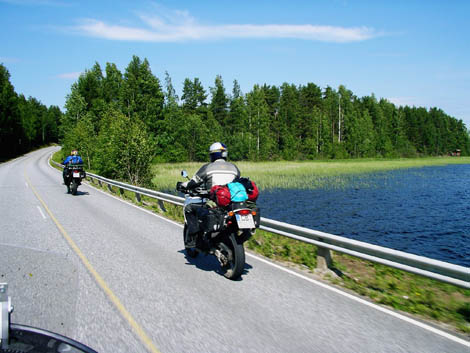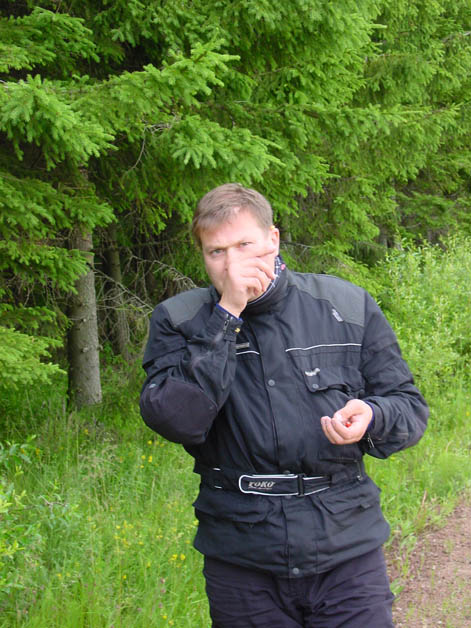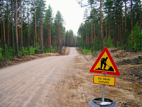 typische Strassen im Hinterland von Finnland, die machen ganz besonders morgens um 6 Uhr bei leichtem Nieselregen Spass ;) als wir sahen, wie Sami mit einem Tourance besohlt dort langgebrettert ist, war uns klar, warum es soviele gute Rallyefahrer in Finnland geben muss