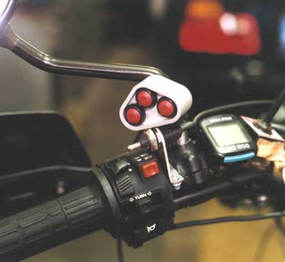 Erst jetzt kam der Stromanschluß fuer das Roadbook an die Reihe. Nun begann ich, die Kabel alle ordentlich unter dem Geweih zu verlegen und zu befestigen. Das war garnicht so einfach, das sich schon ein ordentlicher Wust an Kabel gebildet hatte. Danach konnte die Grundplatte von Touratech montiert werden. Es ergab sich noch ein Prpblem bei der Befestigung der Kontrolllampeneinheit. Die Haltevorrichtung war fuer die Sportversion (8 Dioden untereinander) vorgesehen und ich hatte nun die Standardversion. Mit Heißkleber habe ich die Einheit an den IMO geklebt und zur Sicherheit noch mit einem Kabelbinder fest angezogen. Diese Befestigung ist bombenstabil; ich habe es schon auf ueblen Holperpisten ausprobiert.